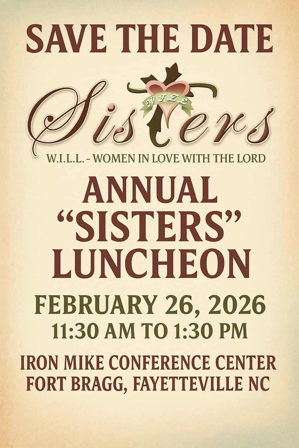 Monthly fellowship for women in uniform. Next meeting is January 16, 2026 at Iron Mike Conference Center. 3rd Friday of each month, 11:30am to 1pm.