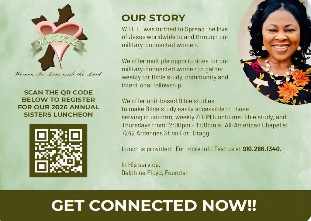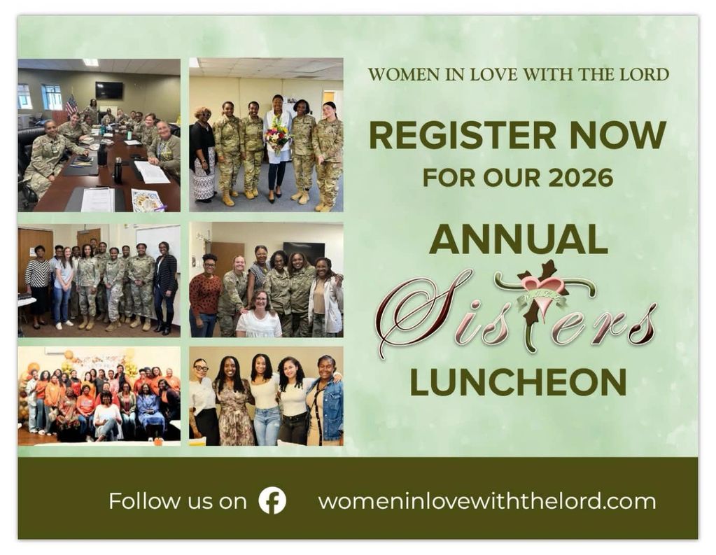 Monthly fellowship for women in uniform. Next meeting is January 16, 2026 at Iron Mike Conference Center. 3rd Friday of each month, 11:30am to 1pm.